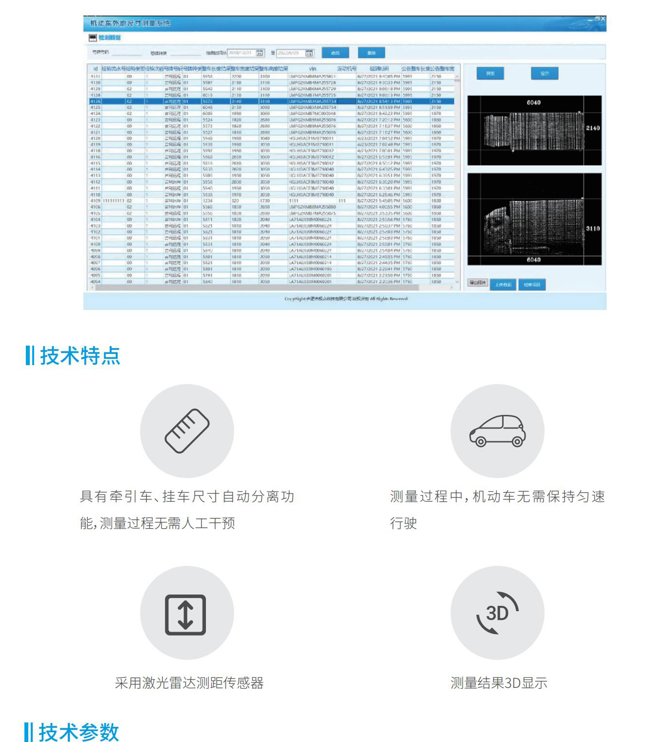 汽車外廓尺寸自動測量儀采用通過中途不停車的方式對機動車的長、寬、高、軸距等尺寸進行檢測。